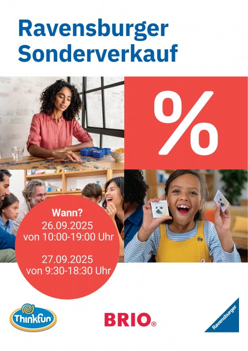 Bei diesem Sonderverkauf erwarten die Besucherinnen und Besucher attraktive Angebote rund um die Marken Ravensburger, ThinkFun und BRIO – ideal für Familien, Kinder und alle Spielbegeisterten.
